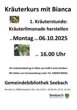 In diesem spannenden Kurs lernen die Teilnehmenden, wie man leckere Kräuterlimonade selbst herstellt. Ein Unkostenbeitrag in Höhe von 4,- Euro wird erhoben. Wir bitten um Voranmeldung unter Tel.: 036929 89935.