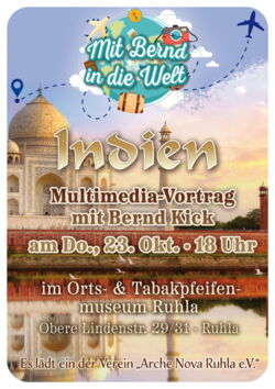 Multimedia-Vortrag mit Bernd Kick über seine Reisen nach Indien. Eintritt frei. Es lädt ein der Verein "Arche Nova Ruhla e.V."