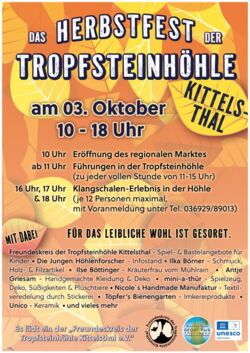 Ein bunter Herbstmarkt mit regionalen Produkten, Kunsthandwerk und Unterhaltung. Ab 11 Uhr finden stündlich Höhlenführungen statt. Besonderes Highlight sind die Klangschalen-Erlebnis-Führungen um 16 Uhr, 17 Uhr und 18 Uhr. Um das Erlebnis für die Teilnehmer zu intensivieren, sind die Klangschalen-Erlebnisse auf jeweils 12 Teilnehmer begrenzt. Voranmeldungen für die Klangschalen-Erlebnisse sind telefonisch unter: 036929 89013 möglich. Für das leibliche Wohl ist gesorgt. Kinder können sich auf spannenden Mitmach-Angebote freuen.