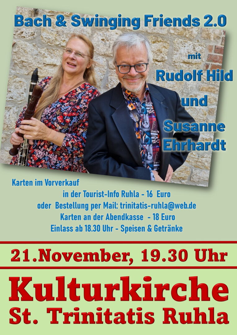 Unter dem Motto „BACH AND SWINGING FRIENDS“ musizieren die bekannte Berliner Blockflötistin und Klarinettistin Susanne Ehrhardt und der Komponist und Arrangeur Rudolf Hild aus Meiningen. Rudolf Hild hat beliebte barocke Werke von Johann Sebastian Bach, sowie seinen Zeitgenossen Antonio Vivaldi, Georg Philipp Telemann und Georg Friedrich Händel für Blockflöte und Klavier adaptiert und mit einer Prise heutiger musikalischer Rhythmen gewürzt und arrangiert.