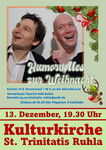 Freuen Sie sich auf einen humorvollen Abend in der Adventszeit bei der szenischen Adventslesung mit Markus Maria Winkler und Jürgen Wegscheider. Eintritt: 14,- Euro (Vorverkauf), 16,- Euro (Abendkasse). Kartenvorverkauf in der Tourist Information Ruhla. Einlass ab 18.30 Uhr. Für Speisen und Getränke sorgt der Trinitatis-Verein.