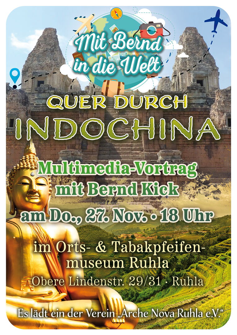 Multimedia-Vortrag mit Bernd Kick über seine Reisen durch Indochina. Eintritt frei. Es lädt ein der Verein "Arche Nova Ruhla e.V."