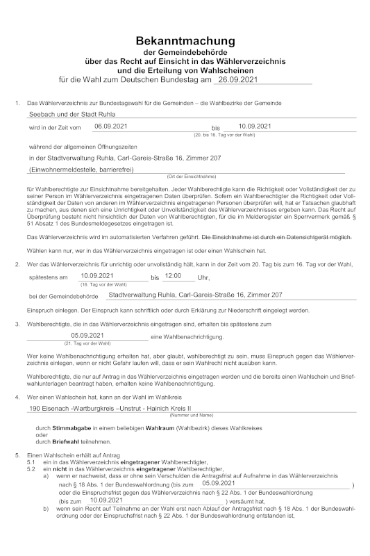 09.08.2021 Wahlen Bekanntmachung Einsicht Wählerverzeichnis Bekanntmachung_Einsicht_Waehlerverzeichnis.pdf (77,4 KiB) Zur Übersicht Aktuell Navigation überspringen Aktuelles Aktuelle Nachrichten Archiv Bekanntmachungen Aktuelle Bekanntmachungen Archiv Veranstaltungen & Termine Veranstaltungen Sitzungstermine