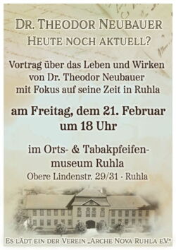 Der Arche Nova Ruhla e.V. lädt herzlich zu einem Vortrag über das Leben und Wirken von Dr. Theodor Neubauer ein. Der Eintritt ist frei.