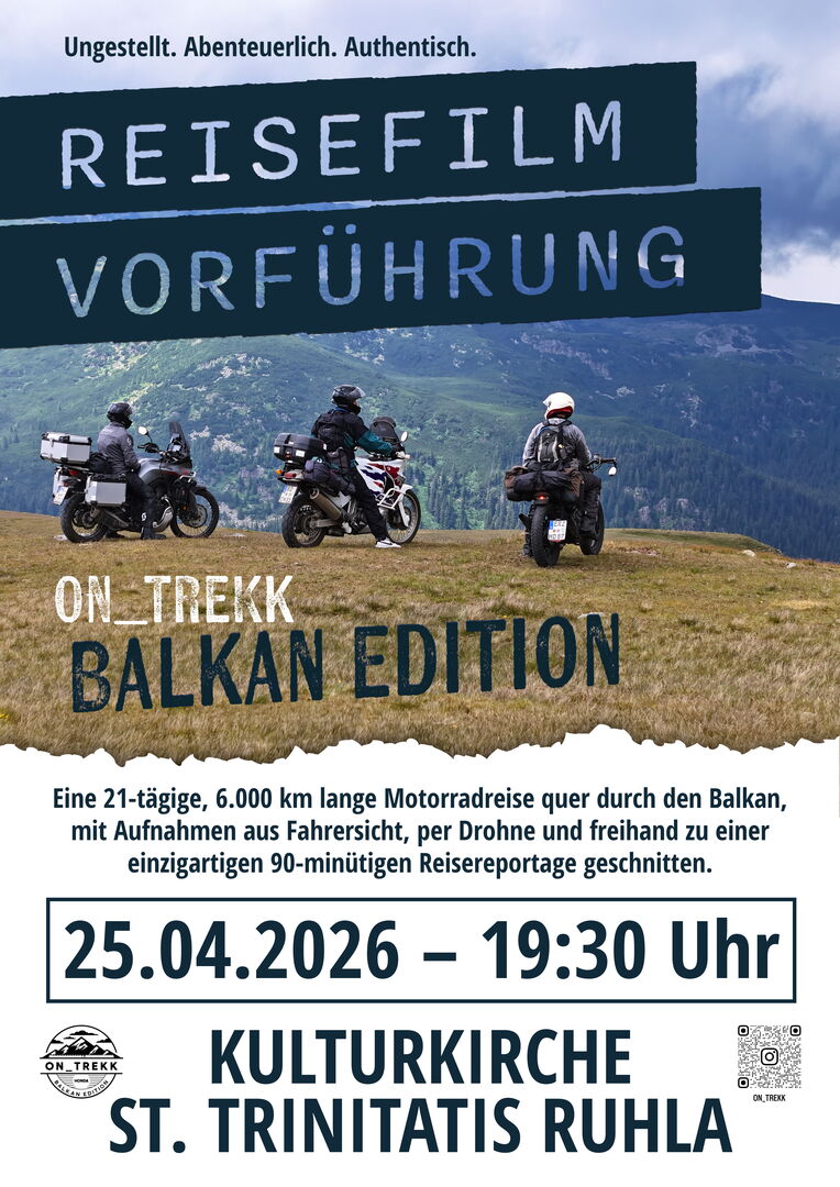 Multimedia-Vortrag von und mit Hannes Drechsel aus Schönau. Eine 21-tägige, 6.000 km lange Motorradreise quer durch den Balkan, mit Aufnahmen aus Fahrersicht, per Drohne und freihand zu einer einzigartigen 90-minütigen Reisereportage geschnitten.