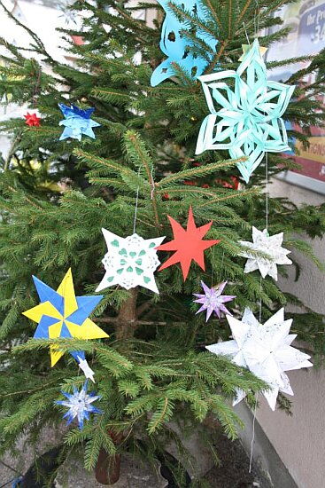 Besondere Freude brachte auch das Schmücken eines Weihnachtsbaumes vor REWE mit selbstgebastelten Sternen.