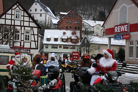 Wer hätte das gedacht! Über 30 geschmückte Quads fuhren wieder durch Ruhla, begleiteten den Weihnachtsmann zum Markt und brachten viele Augen zum Leuchten. Es ist etwas ganz Besonderes, was Ruhla da zu bieten hat. Herzlichen Dank Heiko Neuendorf und allen Quadfreunden, die Ruhla nun seit Jahren die Treue halten und immer wieder für Begeisterung sorgen. Danke auch den Erbstromtalern und dem Posaunenchor Kittelsthal, unserem Märchenerzähler Florian Meyfahrt, den Versorgern Fleischerei Hofmann, Getränke-Stein, Kräuterhexlein Steffi Goldmann, der Kräuterfrau vom Mühlrain Ilse Lena Böttinger, dem Feuerwehrverein Ruhla und der ev. Kirchgemeinde sowie Yvonne Frommann, die für soziale Projekte verkaufte. Danke auch den Händlern für ihr Ausharren in der Kälte. Besonderer Dank gilt natürlich unserem Weihnachtsmann, der wieder über 50 Päckchen an die Kinder verteilen konnte. Zum Abschluß bekam auch er ein Geschenk: einen Wecker, damit der "Sommerschlaf" nicht zu lange ausfällt:-)