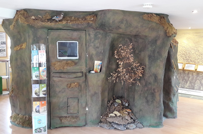 In der ersten Etage befindet sich die Naturparkausstellung mit Infotafeln zur geschichtlichen Entwicklung Ruhlas, zur Besiedlung, zum Handwerk, zur Geologie u.v.m. Eine Erlebnishöhle, ein Modell über eine Schleifkote und ein Gesteinspuzzle laden zum Erkunden und Spielen ein.
